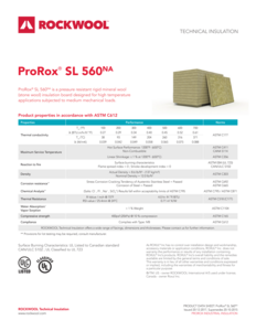 ProRox SL 560NA is a rigid stone wool insulation slab designed for high thermal performance and mechanical durability. With a nominal density of 12 lb/ft3, it resists medium loads and is ideal for flat surfaces on boilers, vessels, tanks, and columns. It maintains good thermal conductivity up to 700 °F, reducing energy loss and enhancing efficiency. Durable, moisture-resistant, non-combustible and meets ASTM C612 Type IVB you can depend on ProRox SL 560NA.